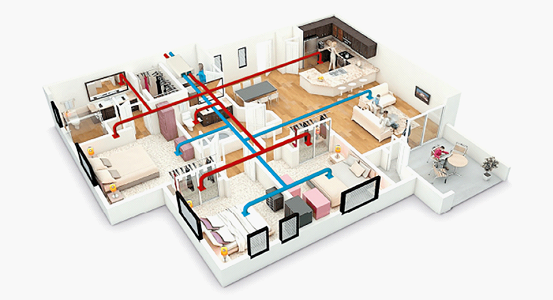 管道式新风系统可满足全屋净化,由于主机风量大,送风面积也较大,可以实现全屋的换气,整体换气效果好。管道式新风系统可通过管道将新鲜空气可送至每个房间,污浊的空气被安装在各个房间的排风口抽出来,这样可以在每个相对独立的空间内形成对流,既保证了全屋的通风换气,又可使室内空气净化得更彻底。
