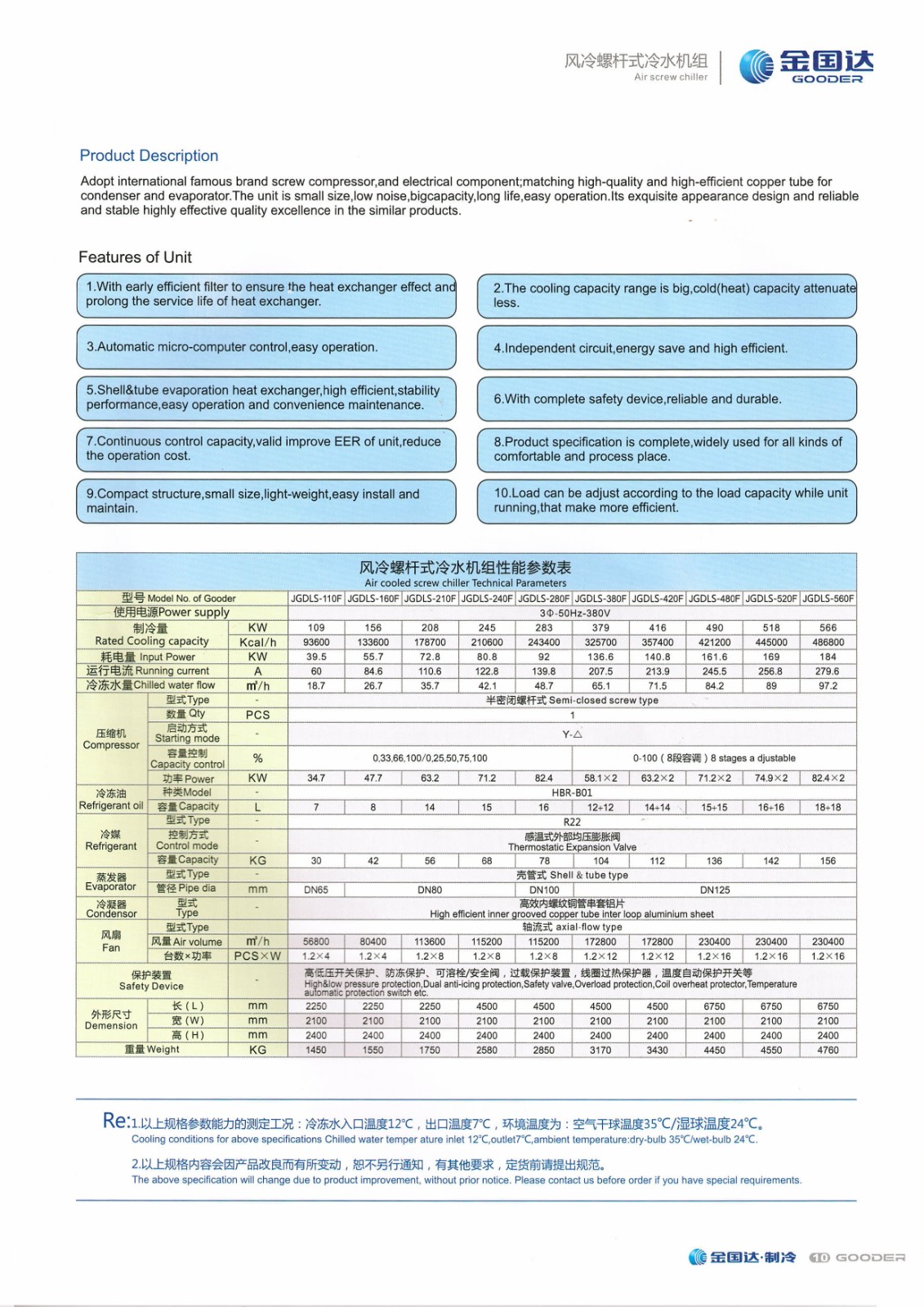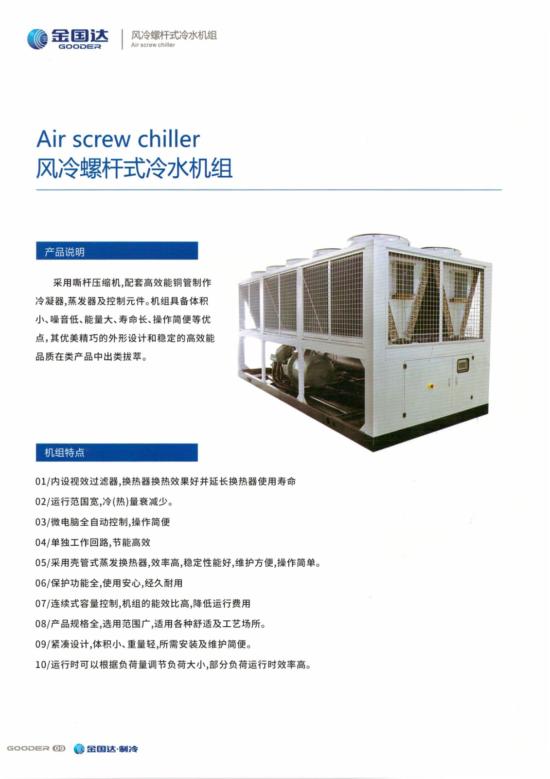 产品描述:风冷螺杆式冷水机组风冷螺杆式冷水机组产品简介:品 名:风冷螺杆式冷水机组; 功 能:冷 媒:热 源:冷 却:认 证: