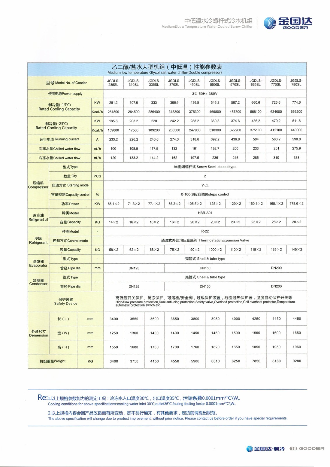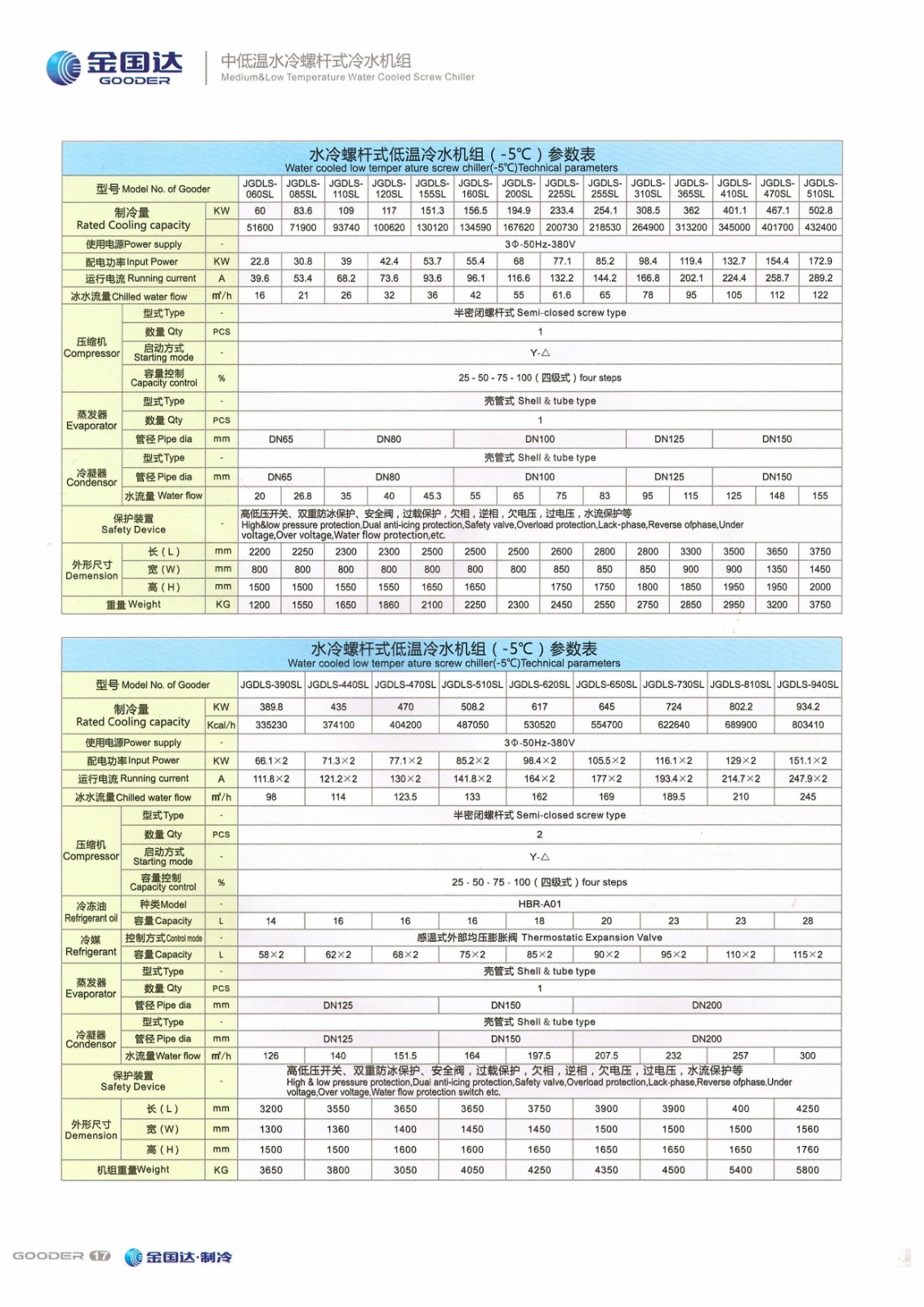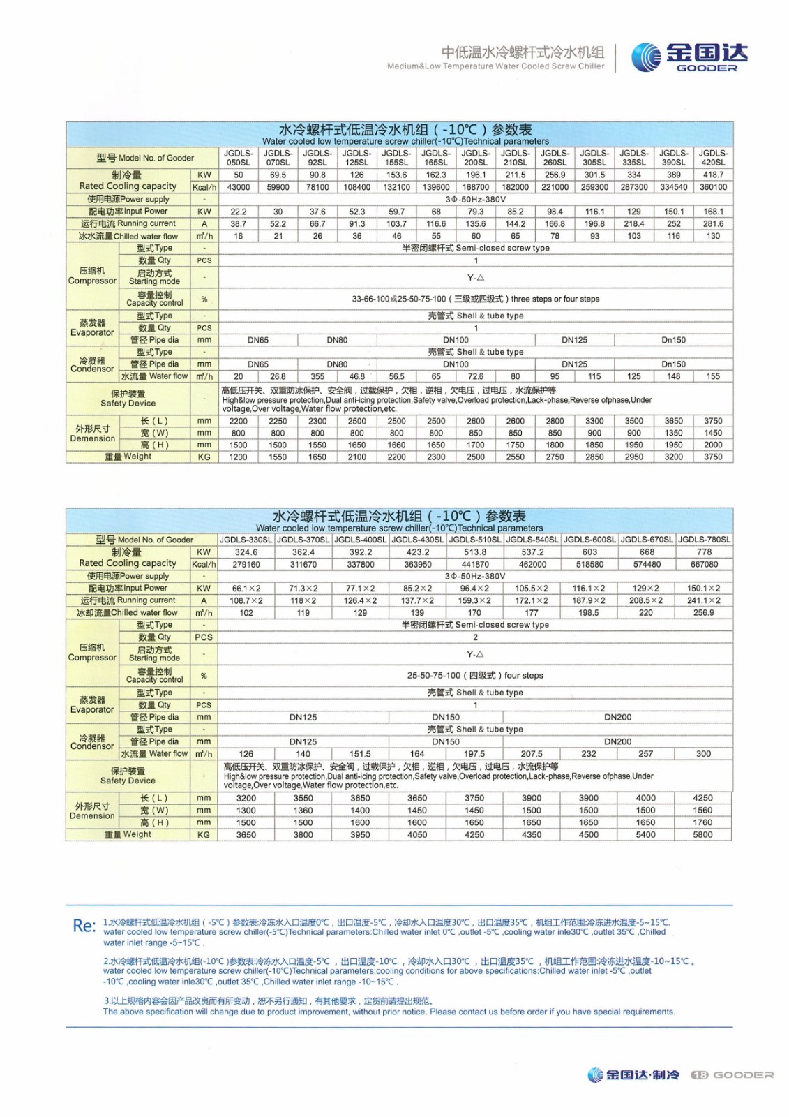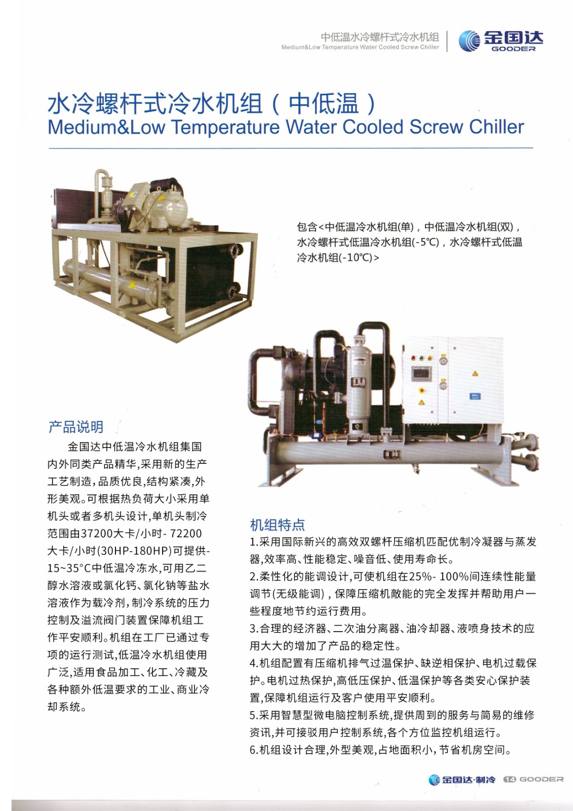产品描述:水冷螺杆式冷水机组(中低温) 中低温冷水机组(单) 中低温冷水机组(双)产品简介:品 名:冷冻冷藏机组; 系 列:JGDZL;压 机:半封闭式、螺杆式(可选);功 能:冷藏、冷冻、热水回收型(余热利用);冷 媒:环保型、常规型(可选);热 源:空气能、冷却塔(地下水、江河水、湖水、海水、生活污水及工业废水等)冷 却:风冷却、水冷却认 证:通过国家节能产品认证;